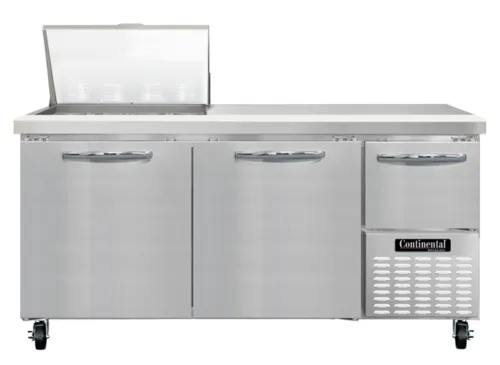 Refrigerated Base Sandwich Unit, 68" wide, #300 Series stainless steel (Mighty) top with (12) 1/6 size x 4" deep non-recessed pans, stainless steel front & sides, galvanized steel case back, aluminum interior, 10" deep nylon cutting board, (2) full & (1) half height field rehingeable doors, electronic controller w/ digital display, 5" casters, , side-mounted refrigerationQ & A