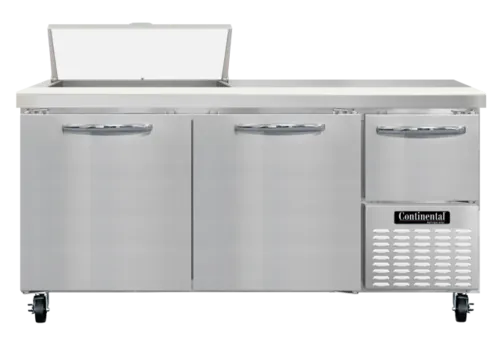 Refrigerated Base Sandwich Unit, 68" wide, #300 Series stainless steel top with (8) 1/6 size x 4" deep non-recessed pans, stainless steel front & sides, galvanized steel case back, aluminum interior, 12" deep nylon cutting board, (2) full & (1) half height field rehingeable doors, electronic controller w/ digital display, 5" casters, side-mounted refrigerationQ & A