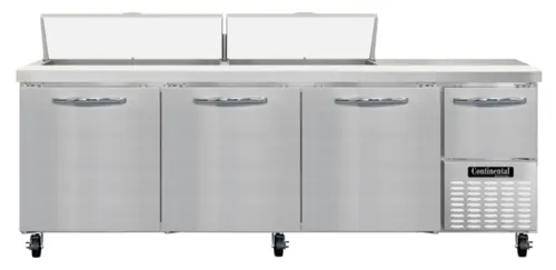 Refrigerated Base Sandwich Unit, 93" wide, #300 Series stainless steel top with (18) 1/6 size x 4" deep non-recessed pans, stainless steel front & sides, galvanized steel case back, aluminum interior, 12" deep nylon cutting board, (3) full & (1) half height field rehingeable doors, electronic controller w/ digital display, 5" casters, , side-mounted refrigerationQ & A