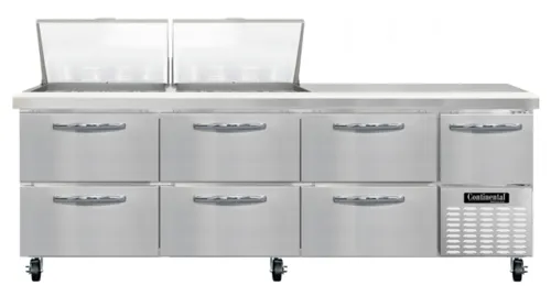Refrigerated Base Sandwich Unit, 93" wide, #300 Series stainless steel (Mighty) top with (24) 1/6 size x 4" deep non-recessed pans, stainless steel front & sides, galvanized steel case back, aluminum interior, 10" deep nylon cutting board, (6) drawers - top drawers hold (1) 12" x 20" + (3) 1/6 pans each & Bottom drawers holds (2) 12" x 20" pans each, (1) half height field rehingeable door, electronic controller w/ digital display, 5" casters, , side-mounted refrigerationQ & A