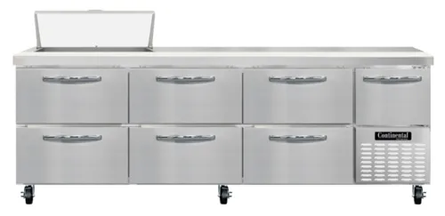 Refrigerated Base Sandwich Unit, 93" wide, #300 Series stainless steel top with (8) 1/6 size x 4" deep non-recessed pans, stainless steel front & sides, galvanized steel case back, aluminum interior, 12" deep nylon cutting board, (6) drawers - top drawers hold (1) 12" x 20" + (3) 1/6 pans each & Bottom drawers holds (2) 12" x 20" pans each, (1) half height field rehingeable door, electronic controller w/ digital display, 5" casters, , side-mounted refrigerationQ & A