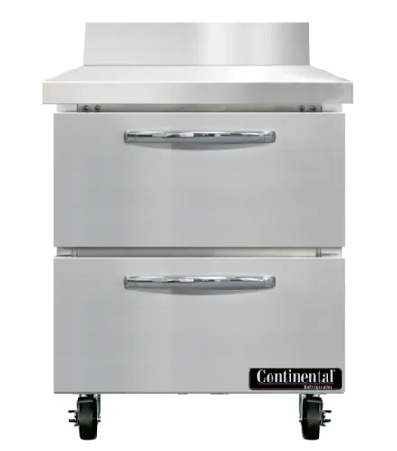 Work Top Refrigerator, 27" wide, one-section, stainless steel top with 5 1/2" backsplash, (2) drawers, accommodates (1) 12 x 20 x 6 pan per drawer (supplied by others), stainless steel front and end panels, aluminum interior, 5" casters, electronic controller w/ digital display, rear mounted self-contained refrigerationQ & A