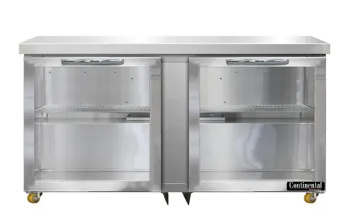 Undercounter Display Refrigerator, 60" wide, two-section, LED lighting, stainless steel front, top and end panels, aluminum interior, 1 3/8" diameter plate casters, front breathing, electronic controller w/ digital display, rear-mounted self-contained refrigerationQ & A