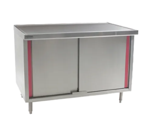 Spec-MasterĀ® Marine Series Work Table, cabinet base with sliding doors, 96"W x 24"D, 14/304 stainless steel top, marine edge on all sides, (4) sliding doors, Uni-LokĀ® gusset system, stainless steel cabinet body, legs, & adjustable bullet feet, NSF