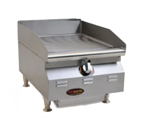 RedHots® Chef's Line® Commercial Countertop Griddle, Natural gas, 15"W x 28-5/16"D x 18"H, 3/4" thick smooth fully welded polished steel griddle plate, 4"H stainless steel splash guard on rear & both sides (sloped front-to-back), stainless steel front & aluminized sides, bullnosed front edge above 45° angled manual controls, 2-3/4" grease drawer, 3-1/2"D front trough with chute, adjustable cast metal legs with flanged feet, 31,250 BTU, NSF, cULus, MADE IN USA (FLYER) (more cooking equipment available including countertop ranges, flat top grills & griddles, commercial grills, commercial restaurant ranges)
