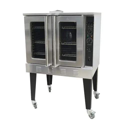 Convection Oven, gas, single deck, (3) 18,000 BTU direct fired inshot burners, 167° to 563°F temperature range, 60-minute electric timer with bell, (2) glass hinged doors, 2- speed motor, removable rack guides, (3) chrome plated racks, cool down function, interior light, automatic ignition, micro shut-off switch, porcelain interior, stainless steel front, galvanized steel sides, adjustable bullet feet, 1/4 HP, 120v/60/1-ph, 54,000 BTU, cETLus, ETL-SanitationQ & A