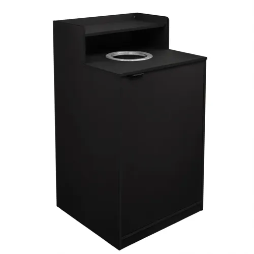 Dell Trash Receptacle, 32 gallon, with upper tray shelf, melamine overlay in a black finish, upper tray shelf with raised border, 8" drop handle, hinged access door with metal handle, blackQ & A