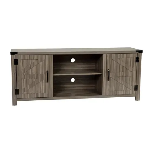 TV Stand, up to 65" TVs, open and closed shelving, classic barn door aesthetic, engineered wood frame, gray wash oak finishQ & A