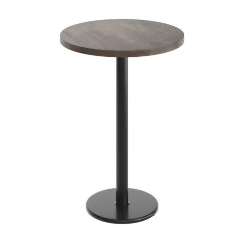 Bennett Commercial Indoor Tabletop, 30" dia. x 42" H, round, 18" round bar height, solid wood, rust-resistant, black cast iron base, dark brownQ & A