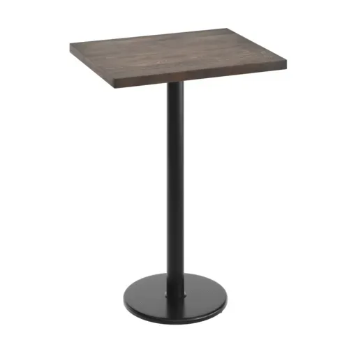 Bennett Commercial Indoor Tabletop, 24"W x 30"D x 42" H, rectangular, 18" round bar height, solid wood, rust-resistant, black cast iron base, dark brownQ & A