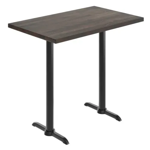 Bennett Commercial Indoor Tabletop, 30"W x 48"D x 42" H, rectangular, dual 5" x 22" bar height, solid wood, rust-resistant, black cast iron, T-bases, dark brownQ & A