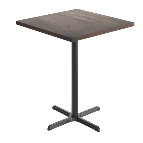Bennett Commercial Indoor Tabletop, 36"W x 36"D x 42" H, square, 30" x 30" bar height, solid wood, rust-resistant, black cast iron, X-base, dark brownQ & A