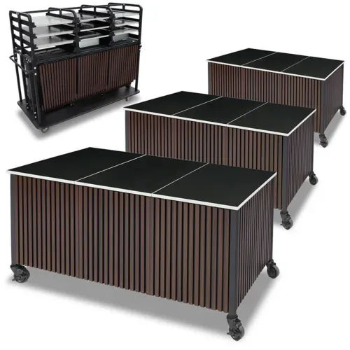 Trio Action Station Three Tables Set, with veneer slat panels, 66"D x 33"W x 32.5"H, storage cart and blank appliance tiles (tile are upgradable)Q & A
