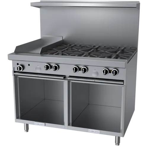 G Starfire Pro Series Restaurant Range, gas, 48", (6) 33,000 BTU open burners, cast iron top & ring grates, (1) 12" griddle, 5/8" thick smooth steel plate, (2) storage bases, stainless steel front, sides, plate rail, 2-piece back guard & shelf, 6" stainless steel legs, adjustable feet, 216,000 BTU, CSA Flame, CSA Star, cCSAus, NSF (Garland)G Starfire Pro Series Restaurant Range, gas, 48", (6) 33,000 BTU open burners, cast iron top & ring grates, (1) 12" griddle, 5/8" thick smooth steel plate, (2) storage bases, stainless steel front, sides, plate rail, 2-piece back guard & shelf, 6" stainless steel legs, adjustable feet, 216,000 BTU, CSA Flame, CSA Star, cCSAus, NSF (Garland)Standard Features: