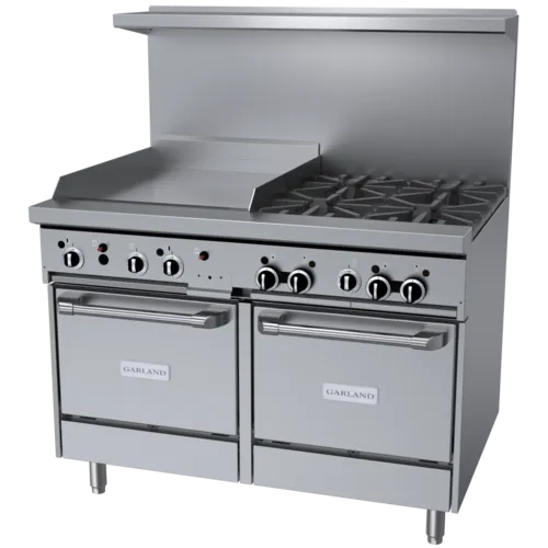 GF Starfire Pro Series Restaurant Range, gas, 48", (4) 26,000 BTU open burners, cast iron top & ring grates,(1) 24" grilddle, 5/8" thick smooth steel plate, thermostatic controls, flame failure, (2) space saver ovens, 3 position rack guides, (1) rack per oven, stainless steel front, sides, plate rail & 10" low profile back guard, 6" stainless steel legs, adjustable feet, 204,000 BTU, CSA Flame, CSA Star, cCSAus, CE, NSF (Garland)GF Starfire Pro Series Restaurant Range, gas, 48", (4) 26,000 BTU open burners, cast iron top & ring grates,(1) 24" grilddle, 5/8" thick smooth steel plate, thermostatic controls, flame failure, (2) space saver ovens, 3 position rack guides, (1) rack per oven, stainless steel front, sides, plate rail & 10" low profile back guard, 6" stainless steel legs, adjustable feet, 204,000 BTU, CSA Flame, CSA Star, cCSAus, CE, NSF (Garland)Standard Features: