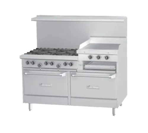 U Series Restaurant Range, gas, 60", (6) 32,000 BTU open burners, with cast iron top & ring grates, 24" raised griddle/broiler on right, manual control, ((1) convection oven with 3-position rack guides & 3 racks, (1) storage base, stainless steel front, sides, plate rail, 2-piece back guard and shelf, 6" stainless steel legs with adjustable feet, 263,000 BTU, CSA Flame, CSA Star, cCSAus, NSF (US Range)Q & A