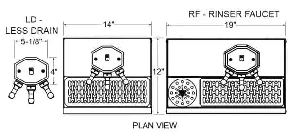 - Available with rinser faucet extension to the left or right of the drain pan. Specify accessory model number RFSS, RFMF, or RFPB for stainless steel, mirror finish, or polished brass respectively