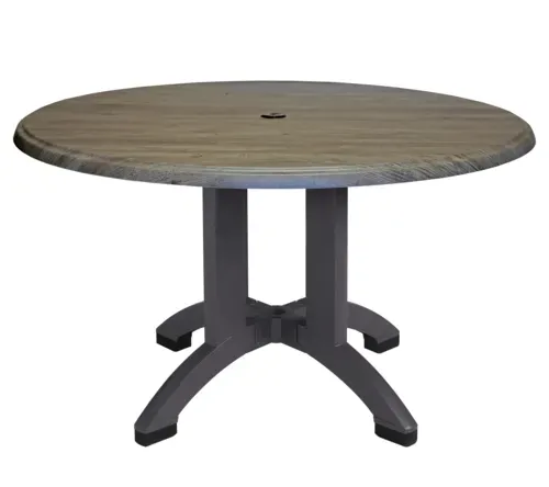 Atlanta Outdoor Table, 42" dia. x 28-2/5"H, round, molded melamine top, with balcony pedestal base, umbrella hole, UV resistant resin, textured wood grain with satin finish, Aged Oak Made in France.Q & A