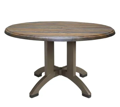 Atlanta Outdoor Table, 42" dia. x 28-2/5"H, round, molded melamine top, with balcony pedestal base, umbrella hole, UV resistant resin, textured wood grain with satin finish, Arizona Made in France.Q & A