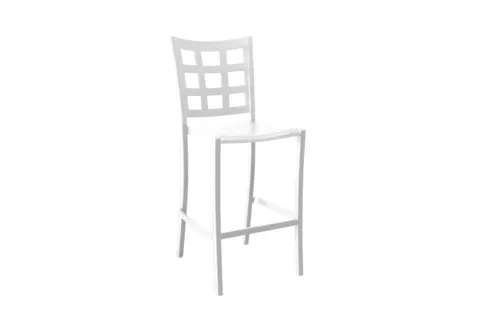 Plazza Stacking Barstool, window back design, aluminum seat and frame, footrest, powder coated finish, glacier white, Made in China (priced per each, packed 8 each per case)Q & A