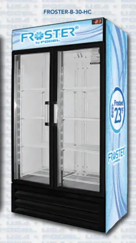 Fogel Vertical Beer Froster, 30 cu. ft. capacity, 43.5"W x 25.88"D x 79"H, 2 Section Vertifcal Beer Froster doors, (96) 12oz. bottle capacity, stainless steel top & sliding doors, galvanized steel cabinet, bottom mount self-contained refrigeration, (2) 1/4 HP, 115v/60/1-ph, 10.4 amps, cULus, UL EPH CLASSIFIEDQ & A