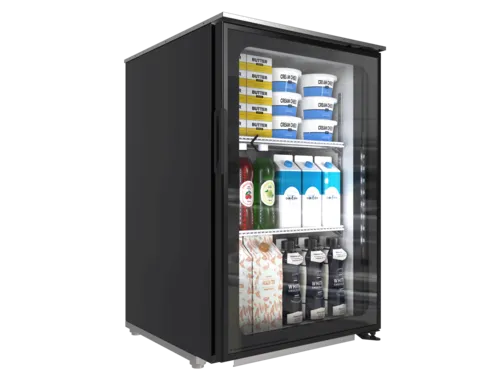 Vertical Cooler, 33-7/10"H x 21"W x 23-2/5"D, one plastic frame door, (2) shelves 17-3/10"W x 12-1/10"D, pre-painted steel exterior and interior, R600 refrigerant 1.1 oz, 0.780 kWh/24h energy consumption, 1/12 HP compressor, finless low maintenance condenser, thermostat setting default 32°F cut-out, 44.6°F cut-in, ETC1H controller, 331.1 Lux LED lighting (4 modules, 8 LEDs per module), 128" cord length, 115V/60/1-ph, 2.0 amps, NEMA 5-15P plug, UL, NSF, ENERGY STAR®Q & A