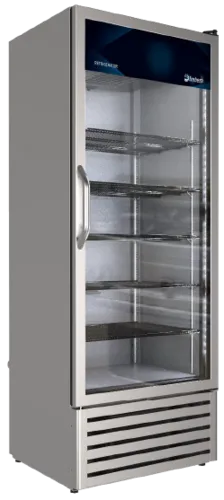 Metallic Vertical Cooler, 79-3/4"H x 29-1/2"W x 30-1/8"D, one aluminum frame door, (5) shelves 24-4/5"W x 19-3/5"D, pre-painted steel exterior and interior, R290 refrigerant, 1/4 HP compressor, finless condenser (low maintenance), thermostat setting default 32°F (0°C) cut-out / 44.6°F (7°C) cut-in, controller EET, 300 Lux LED lighting (3 modules, 8 LED per module and 32 LED per module), 19.29 ft³ usable volume, 52-9/10"H x 24-3/10"W x 19-1/10"D usable interior capacity, spark-free refrigeration components, energy efficient, eco-friendly hydrocarbon refrigerant, 115v/60/1-ph, 7.0 amps, plug type BQ & A