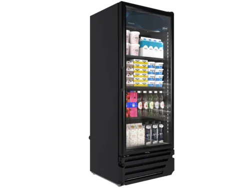 Vertical Cooler, 63-7/8"H x 24-3/4"W x 24-5/8"D, one door with V7 plastic frame, (4) shelves 20-7/8"W x 17-1/4"D, pre-painted steel exterior and interior, R290 refrigerant 1.9 oz, 1/5 HP compressor, finless condenser, thermostat cut-out 32°F (0°C), cut-in 44.6°F (7°C), ETC1H controller, 432 Lux LED lighting with 7 modules (8 LEDs each), spark-free refrigeration components, energy efficient, eco-friendly hydrocarbon refrigerant, low charge, spark-free components, low utility costs, three year limited warranty (additional two years compressor warranty USA & Canada), 115v/60/1-ph, 4.1 amps, NEMA 5-15P plug, UL, NSF, ENERGY STAR®Q & A