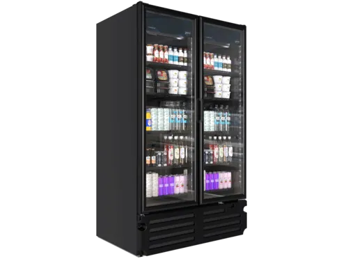 Vertical Cooler, 79-3/8"H x 54-1/4"W x 31-1/2"D, two plastic frame doors, (10) shelves 24-1/4"W x 19-3/4"D, pre-painted steel exterior and interior, R290 refrigerant 3.4 oz, 4.680 kWh/24h energy consumption, 1/4 HP 365 watts compressor, dynamic condenser, thermostat cut-out 44.6°F (7°C) cut-in 32°F (0°C), electronic temperature controller ETC1H, electronic fan motors, LED lighting (144 total LEDs, 6 modules), spark-free refrigeration components, pre-painted steel front shelf, 20 oz bottle capacity 560 total (8 facings per shelf, 80 total facings), 12 oz can capacity 1260 total (18 facings per shelf, 180 total facings), 115v/60/1-ph, 6.6 amps, plug type B, UL, ENERGY STAR®Q & A