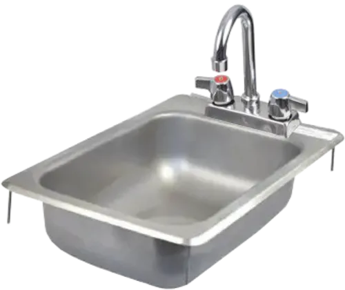 Drop In Hand Sink, one compartment, 12-1/4" x 18" x 5" overall size, 10" x 14" x 5" sink bowl size, 18GA stainless steel apron, 4" OC 2 hole deck mount, includes basket drain w/ crumb cup, sink & faucet includedQ & A