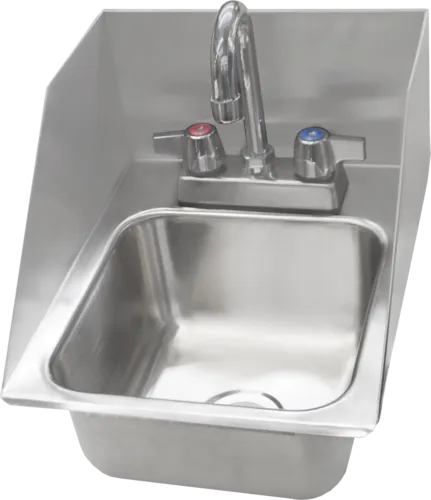 Drop In Hand Sink, one compartment, 18-1/2" x 12-3/8" x 10-1/2" overall size, 10" x 14" x 5" sink bowl size, 18GA stainless steel apron, 4" OC 2 hole deck mount w/ side splashes, includes basket drain w/ crumb cup, sink & faucet includedQ & A