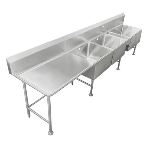 Scullery Three Compartment Sinks are constructed of 14GA or 16GA type 300 stainless steel with single or multicompartment bowls and double wall separators. Sinks are mounted on 16GA, 1 5/8 stainless steel tubes with stainless steel adjustable feet for leveling.