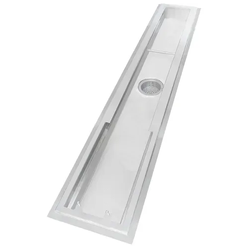 SEC-CFT Security Floor Trough, 264"W x 30"D x 4" deep, 16/304 stainless steel, with beehive strainer, 4" OD tailpiece, locking device welded on trough for gratingQ & A
