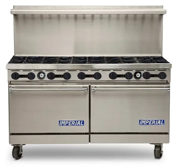 Elements Series Range, (10) cast iron burners, (2) standard ovens, 62"W, stainless steel front, backguard, shelf, kick plate and landing ledge, durable plastic control knobs, full-width removable crumb tray, standing pilot per burner, porcelainized oven bottom, aluminized oven sides/rear/top/door lining, one chrome oven rack per oven, 6" heavy duty legs with adjustable feet, 350,000 BTU/hr, ETL, cETLus, CE, Made in USAQ & A