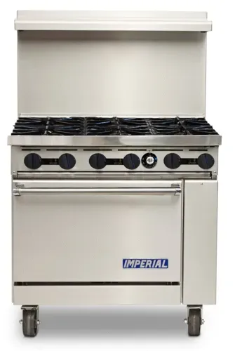 Elements Series Range, (6) open burners, (1) standard oven, 38"W, cast iron burners, standing pilot per burner, stainless steel front, backguard, shelf, kick plate, and 5" landing ledge, removable full-width crumb tray, porcelainized oven bottom, aluminized oven sides/rear/top/door lining, one chrome oven rack, adjustable 6" heavy duty legs, 203,000 BTU/hr, ETL, cETLus, CE, Made in USAQ & A