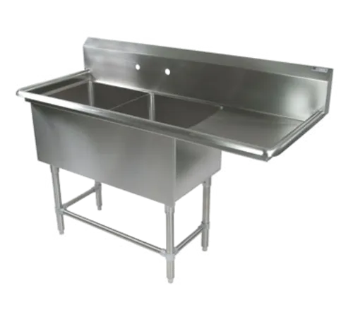 Pro-Bowl Sink, 2-compartment, 58-3/16"W x 29-1/2"D x 44-1/16"H overall size, (2) 18"W x 24" front-to-back x 12" deep compartments, (1) 18" right drainboard, 10"H boxed backsplash with 45° top & 2" return, (1) set of splash mount faucet holes with 8" centers, 3-1/2" die-stamped drain openings, 16/300 stainless steel construction, stainless steel legs, adjustable front & side bracing, adjustable bullet feet, NSF, CSA-Sanitation, KD