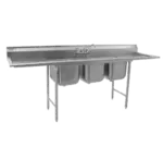 Pro-Bowl Sink, 3-compartment, 88-3/16"W x 23-1/2"D x 44-1/16"H overall size, (3) 18"W x 18" front-to-back x 12" deep compartments, (1) 30" left drainboard, 10"H boxed backsplash with 45° top & 2" return, (1) set of splash mount faucet holes with 8" centers, 3-1/2" die-stamped drain opening, 16/300 stainless steel construction, stainless steel legs, adjustable front & side bracing, adjustable bullet feet, NSF, CSA-Sanitation, KD