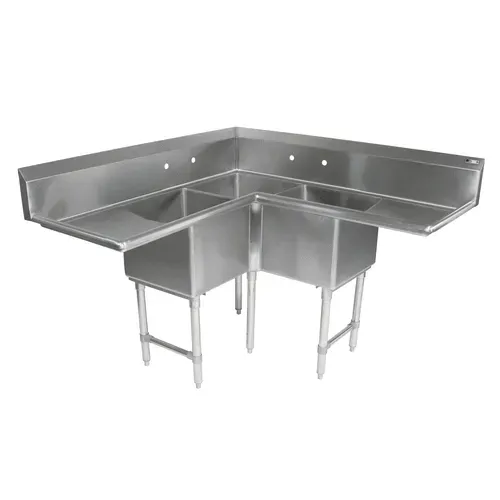 Pro-Bowl Corner Sink, 3-compartment, 82-1/2"W x 82-1/2"D x 44-1/16"H overall size, (2) 18"W x 24" front-to-back x 12" deep compartments & (1) 24"W x 24" front-to-back x 12" deep compartment in corner, (2) 36" left & right drainboards, 10"H boxed backsplash with 45° top and 2" return, (2) sets of splash mount faucet holes with 8" centers, 3-1/2" die-stamped drain opening, 16/300 stainless steel construction, stainless steel legs, bracing, & adjustable bullet feet, NSF, CSA-Sanitation