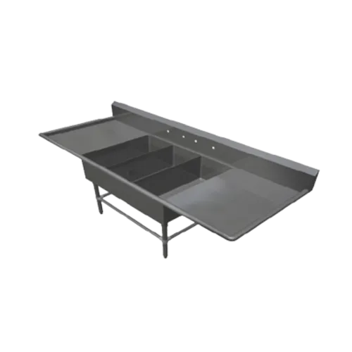 Pro-Bowl Platter Sink, 3-compartment, 81-1/4"W x 36-1/2"D x 43"H overall size, (3) 14"W x 31" front-to-back x 12" deep compartments, (2) 18" left & right drainboards, 10"H boxed backsplash with 45° top and 2" return, (1) set of splash mount faucet holes with 8" centers, 3-1/2" die-stamped drain openings, 14/300 stainless steel construction, stainless steel legs, adjustable front & side bracing, adjustable bullet feet, NSF, CSA-Sanitation, KD
