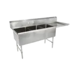 Pro-Bowl Sink, 3-compartment, 53-1/8"W x 23-1/2"D x 44-1/16"H overall size, (3) 16"W x 18" front-to-back x 12" deep compartments, 10"H boxed backsplash with 45° top and 2" return, (1) set of splash mount faucet holes with 8" centers, 3-1/2" die-stamped drain opening, 14/300 stainless steel construction, stainless steel legs, adjustable front & side bracing, & adjustable bullet feet, NSF, CSA-Sanitation