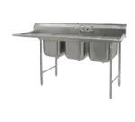 Pro-Bowl Sink, 3-compartment, 65-1/8"W x 25-1/2"D x 44-1/16"H overall size, (3) 20"W x 20" front-to-back x 12" deep compartments, 10"H boxed backsplash with 45° top and 2" return, (1) set of splash mount faucet holes with 8" centers, 3-1/2" die-stamped drain opening, 14/300 stainless steel construction, stainless steel legs, adjustable front & side bracing, adjustable bullet feet, NSF, CSA-Sanitation, KD