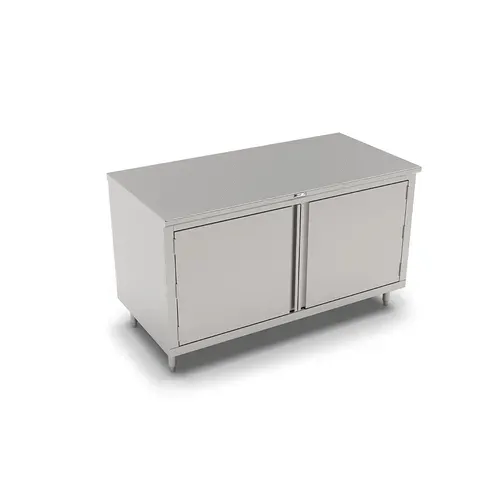 Work Table, cabinet base with (1) set of hinged doors, 60"W x 30"D, 16/300 stainless steel flat top, Stallion Safety Edge front, 18/430 stainless steel wrap, stainless steel legs with adjustable feet, NSFQ & A