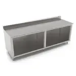Work Table, cabinet base with open front, 144"W x 24"D, 14/300 stainless steel top with 5" backsplash, Stallion Safety Edge front, 18/430 stainless steel wrap, stainless steel legs with adjustable feet, NSFQ & A