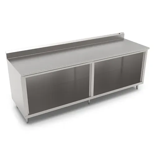 Work Table, cabinet base with open front, 120"W x 24"D, 16/300 stainless steel top with 5" backsplash, Stallion Safety Edge front, 18/430 stainless steel wrap, stainless steel legs with adjustable feet, NSFQ & A