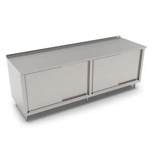 Work Table, cabinet base with sliding doors, 120"W x 24"D, 14/300 stainless steel top with 1-1/2" rear up-turn, Stallion Safety Edge front, 18/430 stainless steel body, stainless steel legs with adjustable feet, NSFQ & A