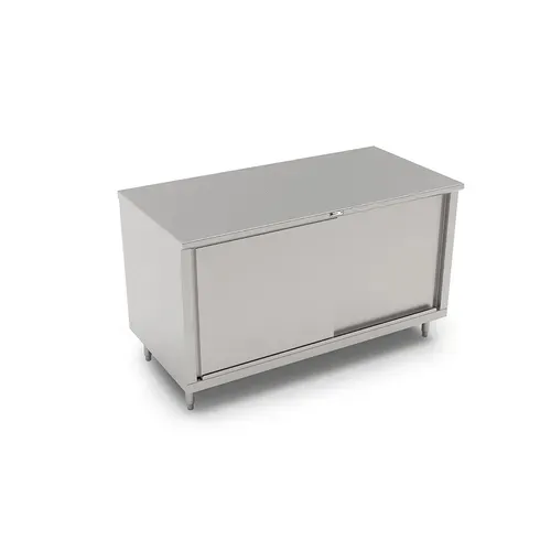 Work Table, cabinet base with sliding doors, 48"W x 36"D, 16/300 stainless steel flat top, Stallion Safety Edge front, 18/430 stainless steel body, stainless steel legs with adjustable feet, NSFQ & A