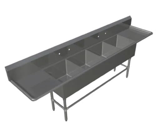 Pro-Bowl Sink, 4-compartment, 123-1/4"W x 29-1/2"D x 44-1/16"H overall size, (4) 18"W x 24" front-to-back x 14" deep compartments, (2) 24" left & right drainboards, 10"H boxed backsplash with 45° top & 2" return, (2) sets of splash mount faucet holes with 8" centers, 3-1/2" die-stamped drain openings, 16/300 stainless steel construction, stainless steel legs, adjustable front & side bracing, adjustable bullet feet, NSF, CSA-Sanitation, KD
