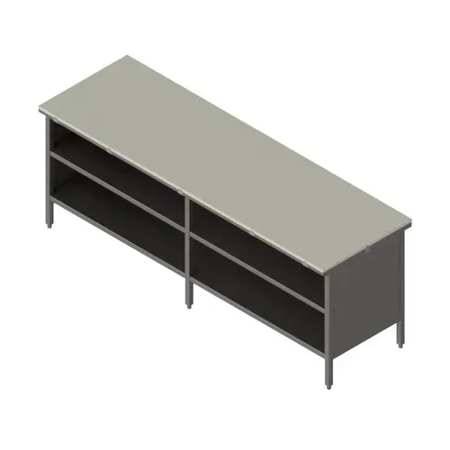 Work Table, cabinet base with open front, 108"W x 30"D, 3/4" reversible poly surface, Stallion Safety Edge front & back, 16/300 stainless steel top, stainless steel construction, undershelf, & 1" adjustable bullet feet, all welded set-up, NSFQ & A