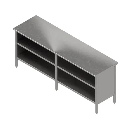 Work Table, cabinet base with open front, 144"W x 24"D, 16/300 stainless steel flat top, Stallion Safety Edge front & back, 90° turndown on sides, stainless steel base, undershelf, & 1" adjustable bullet feet, all welded set-up, NSF (image shown with optional midshelf)Q & A