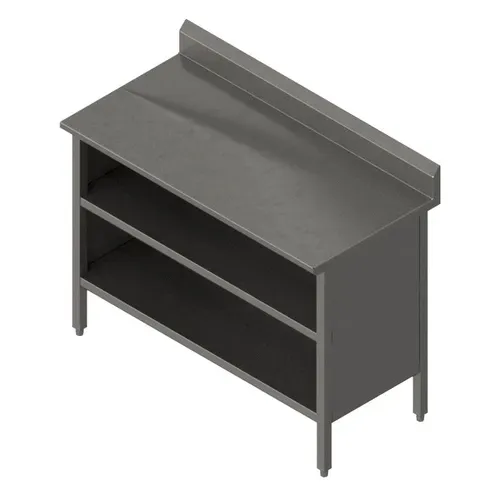 Work Table, cabinet base with open front, 72"W x 24"D, 16/300 stainless steel top with 5" backsplash, Stallion Safety Edge front, 90° turndown on sides, stainless steel base, undershelf, & 1" adjustable bullet feet, all welded set-up, NSF (image shown with optional midshelf)Q & A